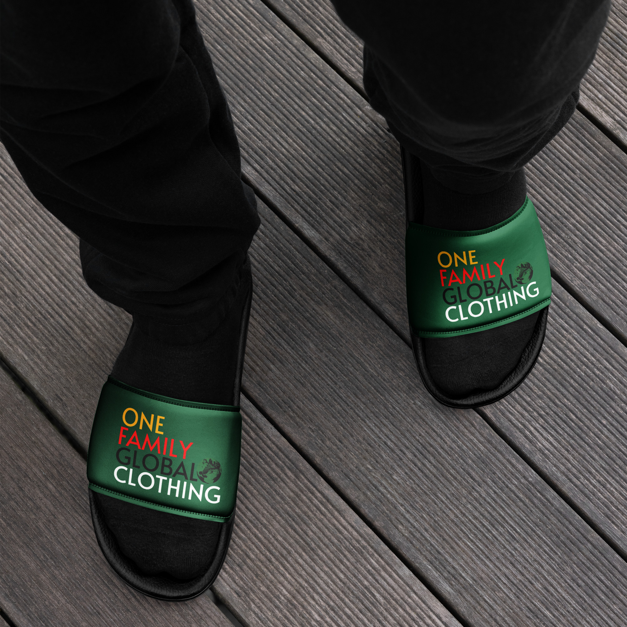 Celebrate bold heritage with every step. The One Family Global Clothing Women’s Slides – Guyana Edition are inspired by the dynamic colours and powerful symbolism of the Guyanese flag. The green represents the country’s lush forests, gold its mineral wealth, red the zeal of its people, and black and white the endurance and river systems that run through this Land of Many Waters.