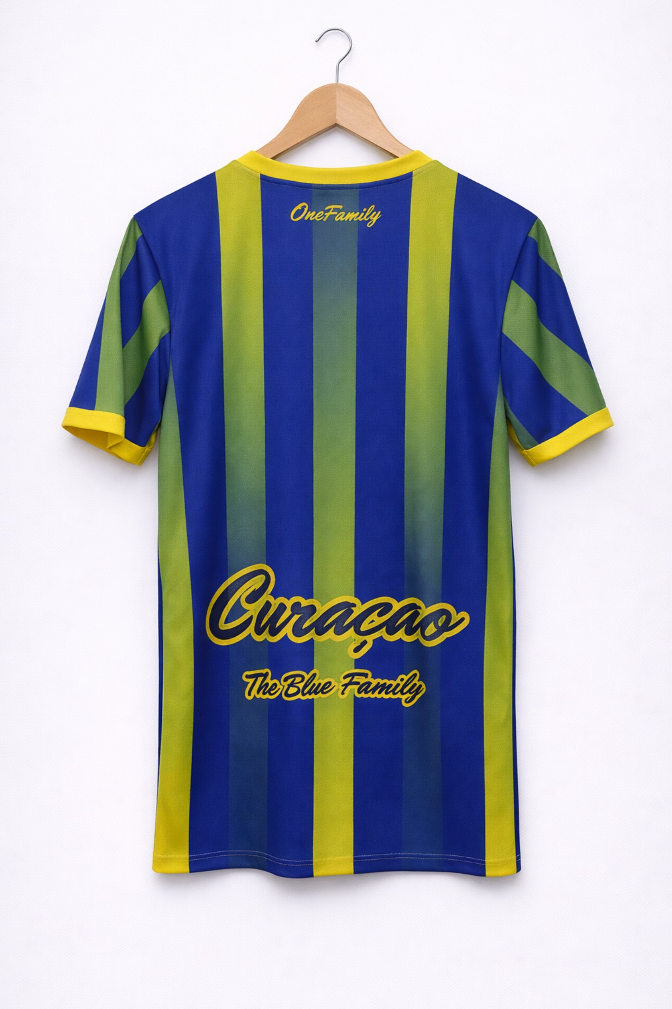 This jersey features a rich deep blue base, reflecting the clear Caribbean waters and open skies that surround the island. Accents of bright yellow and green draw inspiration from the colours associated with Curaçao’s culture and landscape, creating a striking striped design that brings energy and movement to the jersey. The body is enhanced with a subtle geometric pattern that adds texture and depth, while the signature One Family script across the chest symbolises unity, culture, and Caribbean identity across the global diaspora.